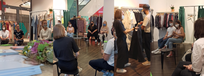 Wie kann ein verpackungsreduzierter Versand aussehen und was passiert mit anfallenden Stoffresten? – Diese und viele weitere Fragen aus der Runde ließen uns in einen spannenden Austausch treten. Gemeinsam reflektierten wir unser eigenes Einkaufsverhalten und tauschten Ideen für einen wertschätzenden Umgang mit Kleidung aus.