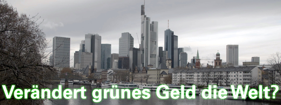 Foto im Header: Skyline mit Bankhochhäusern in Frankfurt am Main. Die Strategie der grünen Geldanlage: Unternehmen, die ökologisch wirtschaften, werden belohnt. / © ZDF und Uli Sontag
