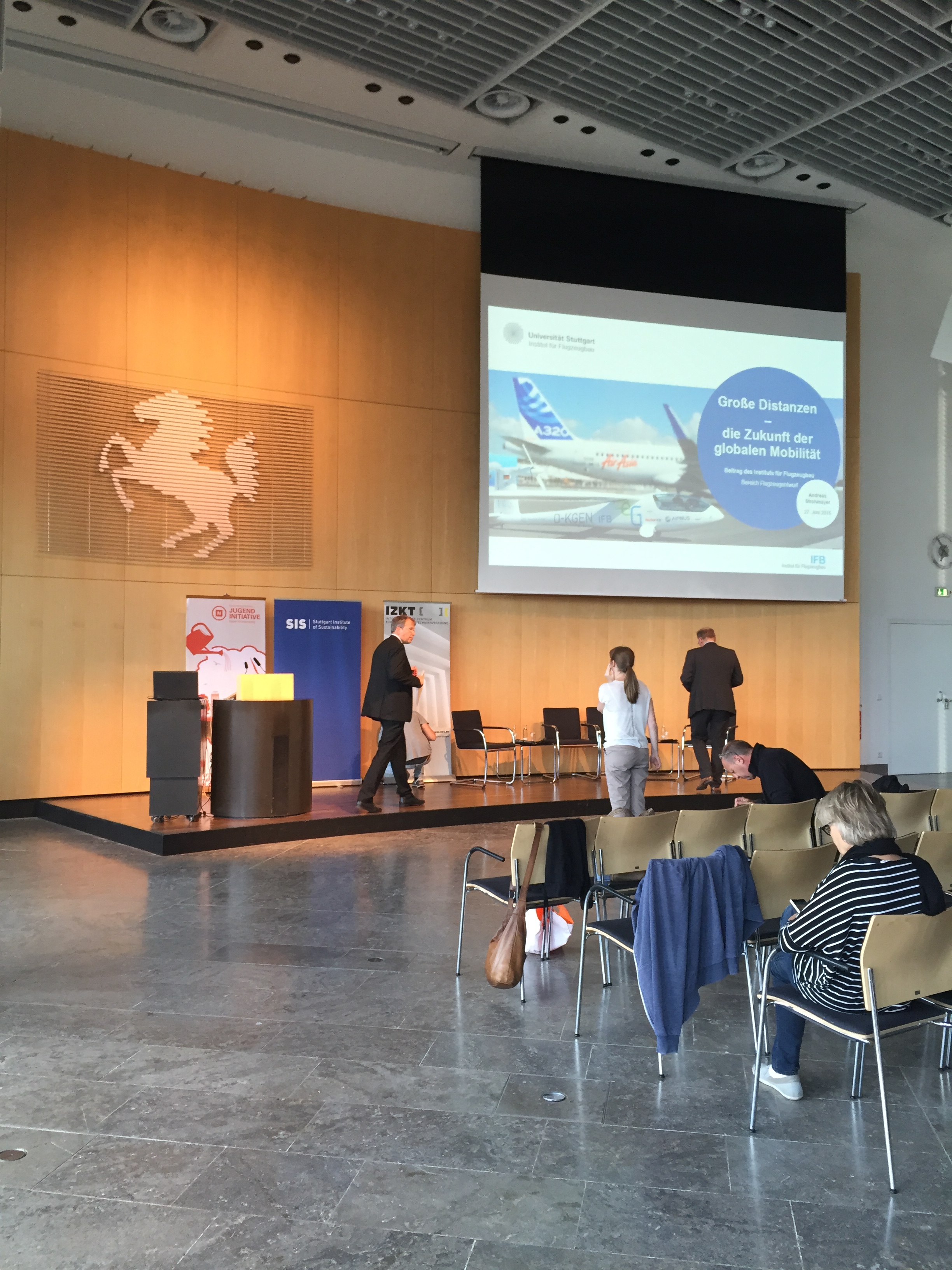 Neben Moderator Dr. Frank Heinlein saßen noch Dr. habil. Weert Canzler, Prof. Dr. Torsten Kirstges und Prof. Dr.-Ing. Andreas Stohmayer auf dem Podium. Das Hauptproblem, mit welchem die Wissenschaftler zu kämpfen haben, ist es, eine Möglichkeit zu finden, lange Strecken mit anderen Verkehrsmitteln als dem Flugzeug zu absolvieren. Prof. Dr. Torsten Kirstges zeigte anhand eines Diagramms, dass die Kurve der Flugreisen weiterhin ansteigt und sich das in den nächsten Jahrzehnten wohl kaum ändern wird. Die Technik leistet hierzu ihren Beitrag: immer mehr Menschen können gleichzeitig von einer Maschine befördert werden, was dazu führt, dass die Preise verhältnismäßig erschwinglich bleiben und somit viele Menschen auf die Möglichkeit des Fliegens zurückgreifen.