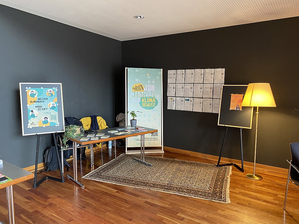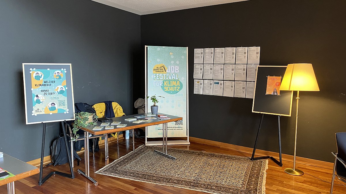 Auf dem Markt der Möglichkeiten des jungen Kongress’ in Nürtingen hatten wir einen eigenen Stand, um auf das Jobfestival für Klimaschutz aufmerksam zu machen. Unser Stand mit gemütlichen Wohnzimmer-Vibes sorgte schon beim Aufbau, als wir mit flauschigem Teppich und Stehlampe anrückten, für Schmunzeln.