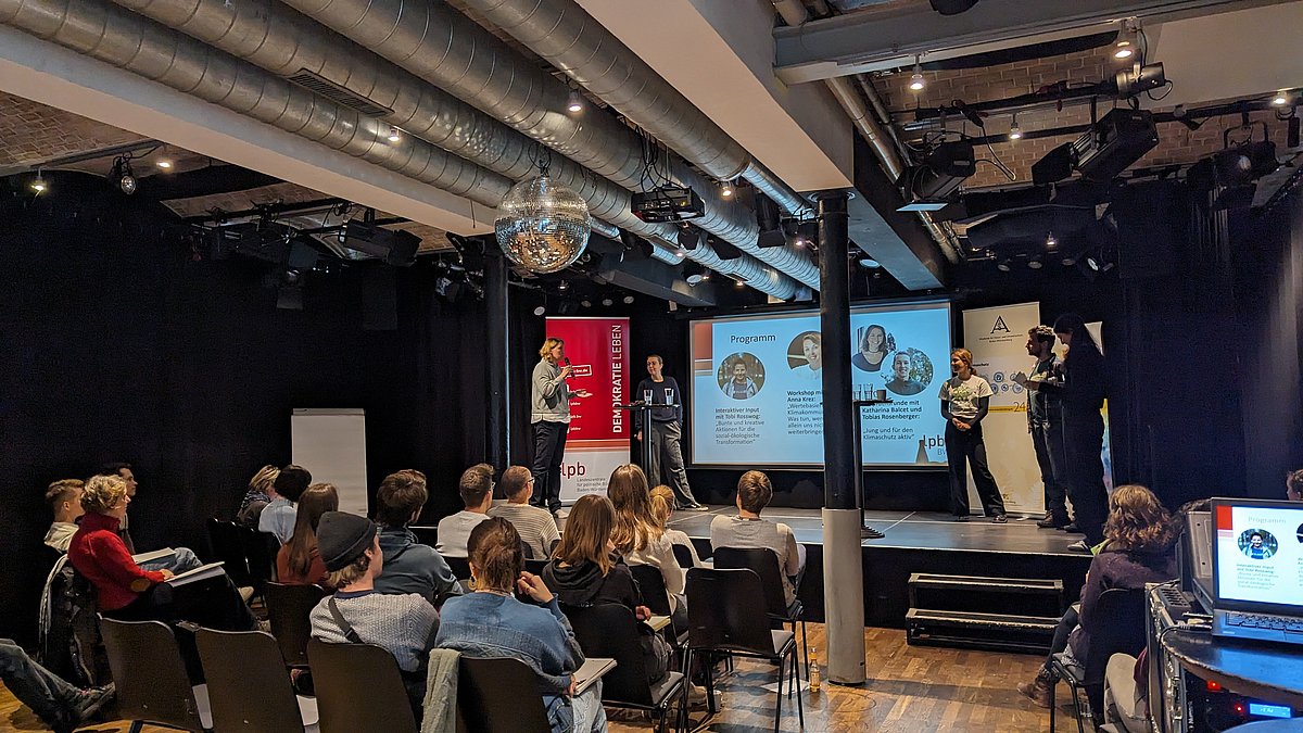 Zu Beginn berichtete Tobi Rosswog (Aktivist und Autor) von Aktionen in Wolfsburg, wie dem Protestcamp gegen das damals geplante VW-Werk, in dem die E-Limousine Trinity gebaut werden sollte. Tobis Tipp: ,,Sucht euch Gleichgesinnte und setzt euch gemeinsam für den Klimaschutz ein. "