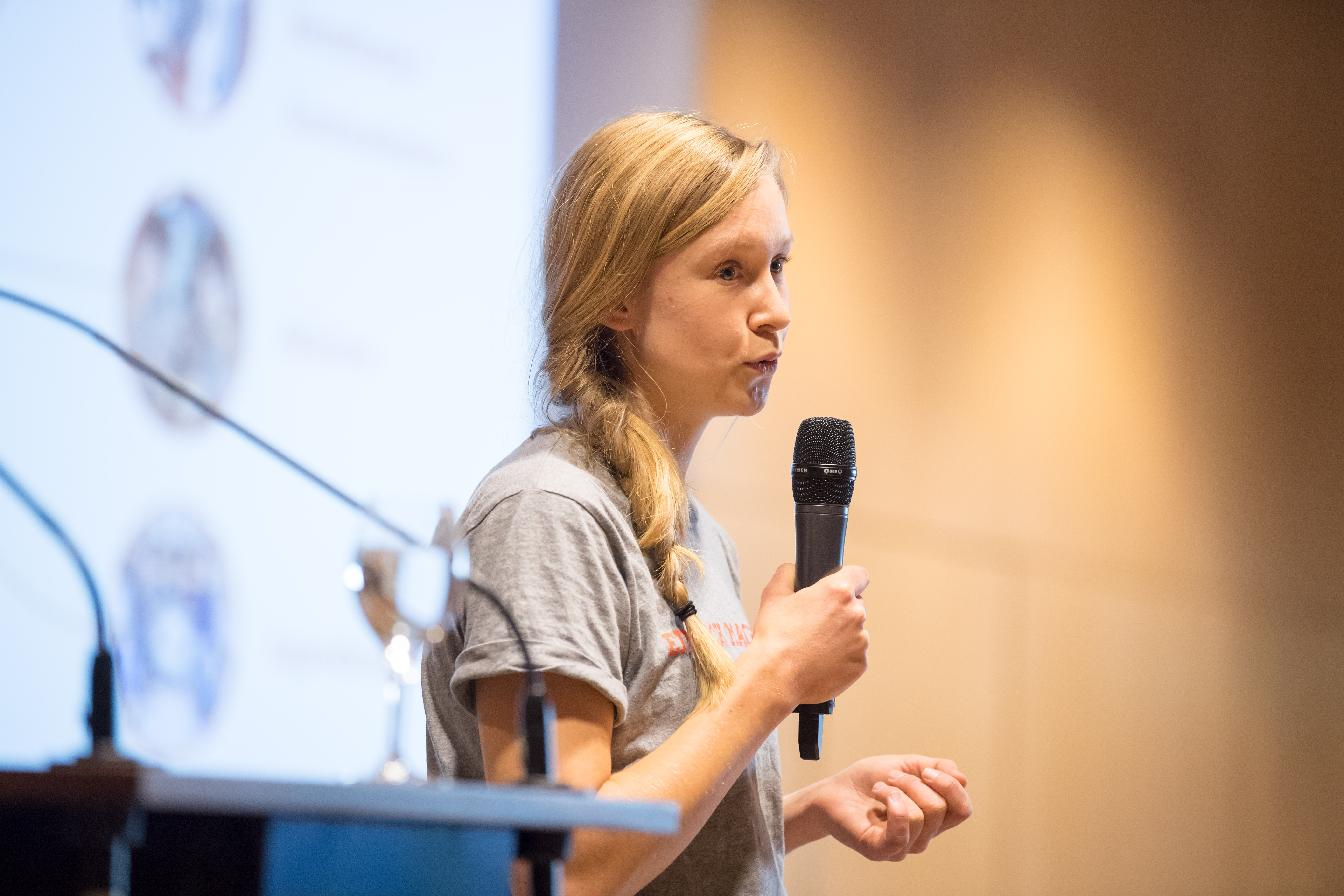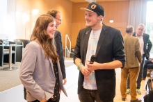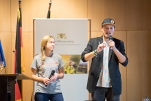 Nach einem einleitenden Grußwort des Staatssekretärs des Ministeriums für Umwelt, Klima und Energiewirtschaft Baden-Württemberg, Dr. Andre Baumann, präsentierten die Jugendbeiräte der Nachhaltigkeitsstrateie Baden-Württemberg, Anna Bäuerle und Sander Frank, die Leitfragen des Abends.