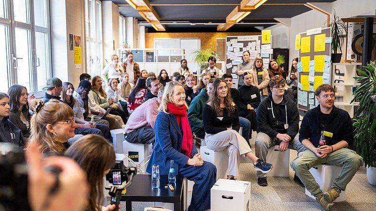 Die Ministerin beantwortete zum Einstieg persönliche Kennenlernfragen, über die sich auch die jungen Zufallsbeteiligten beim ersten Termin kennenlernten. „Sind Sie eher Typ Döner oder Falafel?“, „Welcher Gegenstand darf nicht fehlen, wenn Sie das Haus verlassen?“ – Ermutigt durch den sympathischen Einstieg, stellten die Teilnehmenden im Anschluss eine Frage nach der Anderen: Wie steht es um den Ausbau der Windkraft? Wie wurde bisher versucht, Menschen mitzunehmen, die sich wenig für Klimaschutz interessieren? Was passiert mit den Vorschlägen, die wir hier erarbeiten? – Auch die Ministerin war neugierig, von den jungen Menschen zu erfahren: Habt ihr vor der Zufallsbeteiligung schon mal etwas vom Umweltministerium mitbekommen? Was beschäftigt euch? Findet ihr es überhaupt wichtig, Klimaschutz voranzutreiben? Das ca. einstündige Gespräch war für die Zufallsbeteiligten wichtig, um zu spüren, dass ihre Einbringungen gehört werden und sich der Zeitaufwand lohnt.