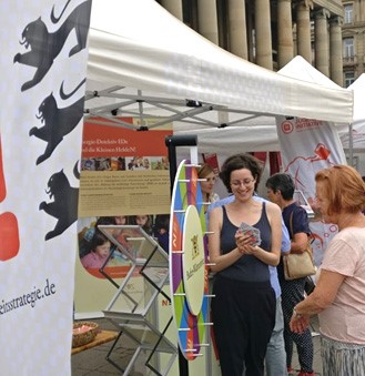 Zwei junge Männer hatten besonders Spaß. Trotz Migrationshintergrund und ihrer erst kurzen Zeit in Deutschland sprachen sie sehr gut Deutsch. Vor allem aber zeigten sie sich sehr interessiert. Sie wollten möglichst viel darüber erfahren, was sie privat ändern können, ohne sich selbst allzu stark einschränken zu müssen. Insbesondere im Bereich Kochen und wie man keine Lebensmittel verschwendet. So haben wir sie zum Beispiel über Foodsharing informiert, wovon sie noch nie gehört hatten. Die Idee aber super fanden. Am Ende des Gespäches drehten sie am Glücksrad, gewannen und jubelten über die zwei Kochbücher, die sie schon zu Beginn unseres Gesprächs ins Visir genommen hatten.
