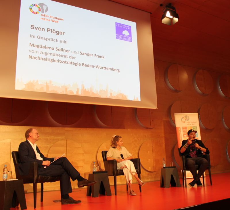 Wie das konkret gelingen kann? Diese Frage diskutierte Sven Plöger mit Magdalena Söllner und Sander Frank, die sich beide seit drei Jahren im Jugendbeirat der Nachhaltigkeitsstrategie Baden-Württemberg engagieren. Der Jugendbeirat hat die Aufgabe, für nachhaltiges Handeln im Alltag zu begeistern und die Anliegen von jungen Menschen aus Baden- Württemberg an die Politiker*innen des Landes zu kommunizieren.