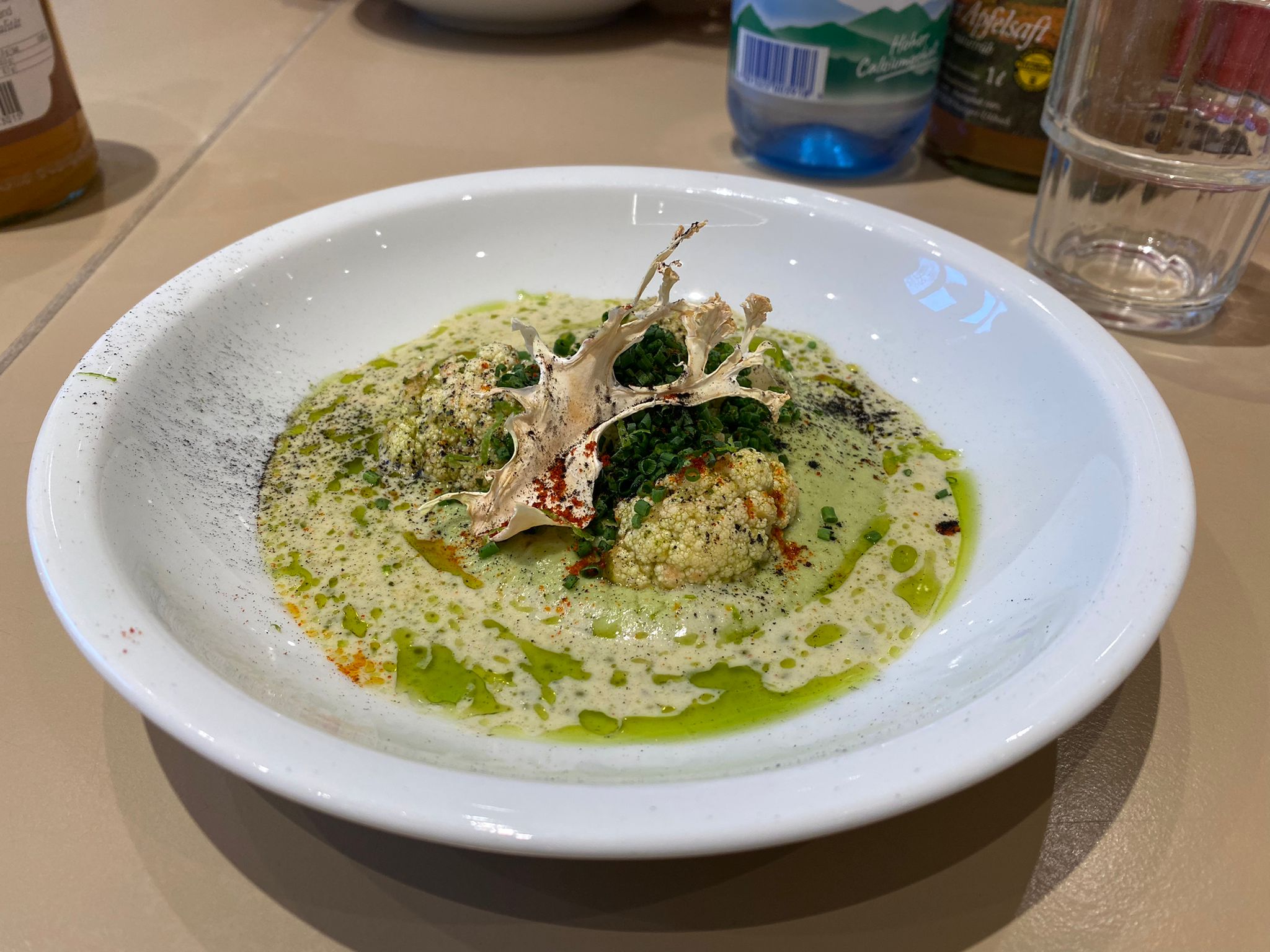 - Blumenkohlpüree mit verschiedenen Texturen, dazu gehören Asche-Rauch- und Säurearomen