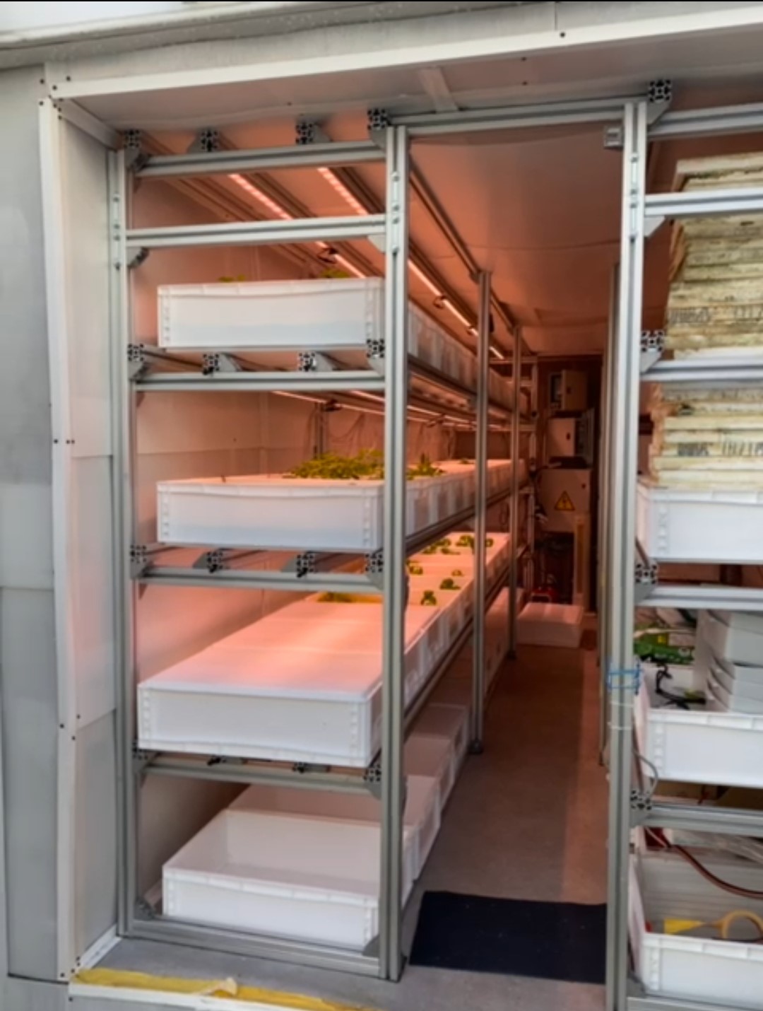 Im Anschluss haben wir die Kisten nach und nach auf mehrere Etagen Im Container verteilt. Durch die Etagen gab es rechts und links auf den Schienen genug Platz für alle Kisten und Kräutersorten. Für das optimale Pflanzenwachstum gibt es dazu ein paar Tricks, wie die Installation von Luftpumpen, die Sauerstoff ins Wasser sprudeln und damit auch das Algenwachstum unterbinden. Durch weitere Tools, wie Temperatur-Einstellungen haben wir es den Pflanzen im Container ordentlich gemütlich gemacht – sie sollen ja prächtig gedeihen. Für noch mehr Komfort sorgen die rot-gelben LED-Lämpchen über den Kräutern.