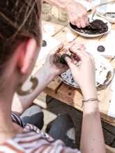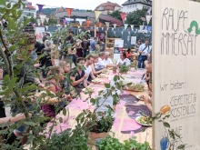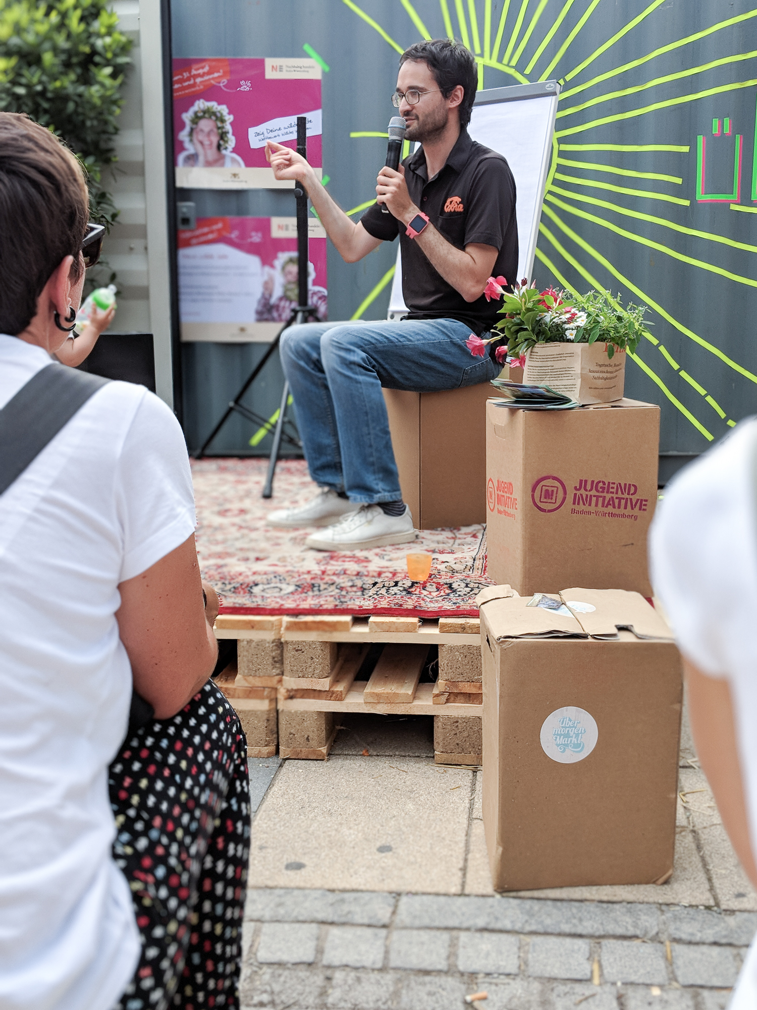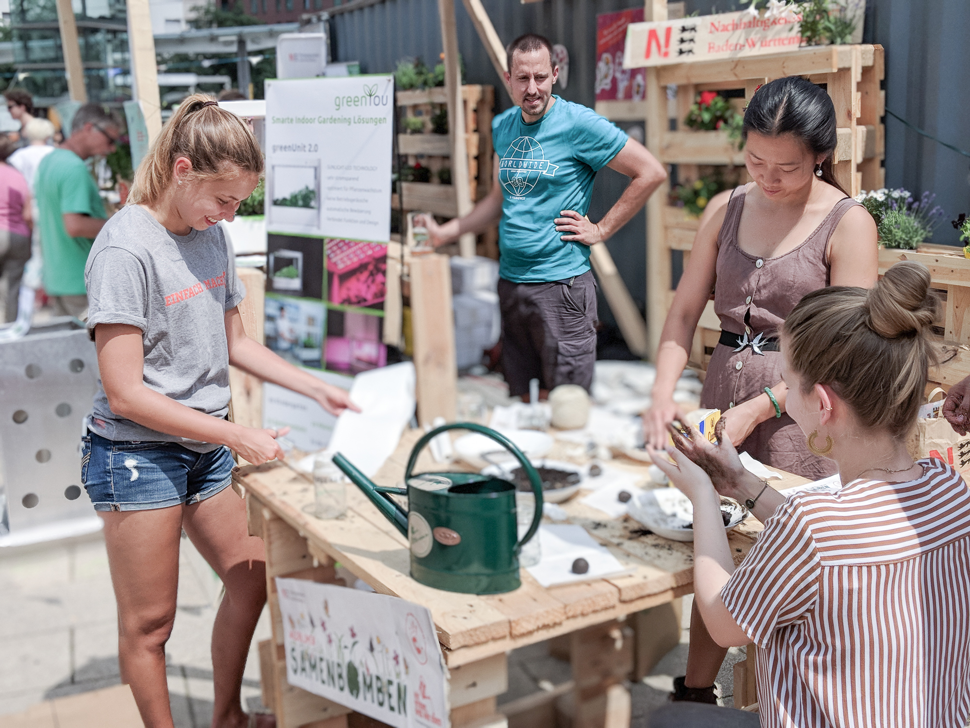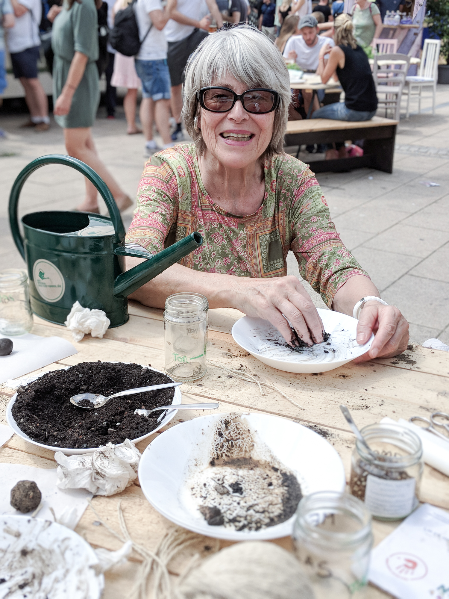 Auch an unserem Stand, dem Stand der Jugendinitiative, war Vielfalt geboten. Genau genommen ging es um die Themen Artenvielfalt und urbanes Gärtnern. Zwei wichtige Themen, die für eine zukunftsfähige Stadt eine zentrale Rolle spielen. Um die städtische Artenvielfalt zu fördern, haben sich viele Standbesucher*innen im wahrsten Sinne des Wortes ihre Hände schmutzig gemacht. Bei strahlendem Sonnenschein bastelten junge und ältere Besuchende mit Begeisterung Samenbomben. Diese Kugeln, bestehend aus Erde, Ton und einheimischen Wildblumensamen, bieten eine ideale Nahrungsquelle für bestäubende Insekten.