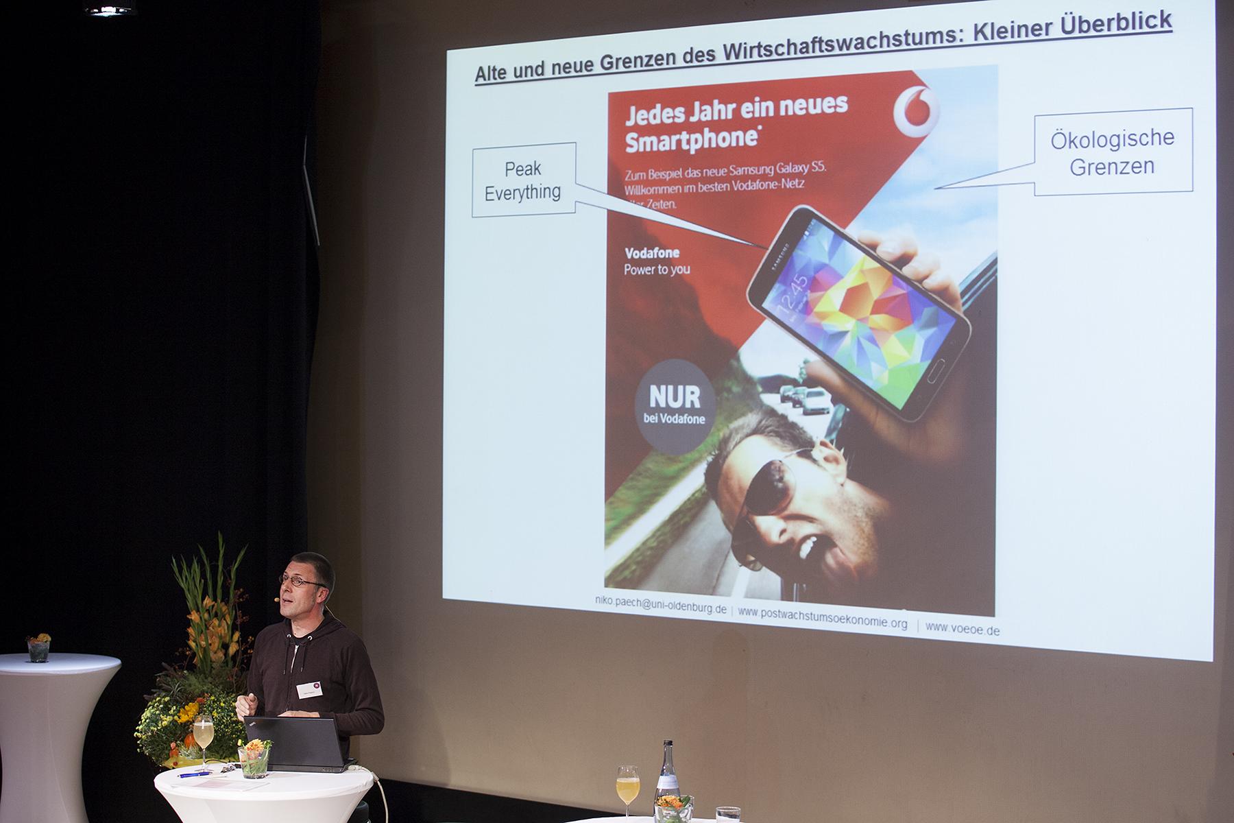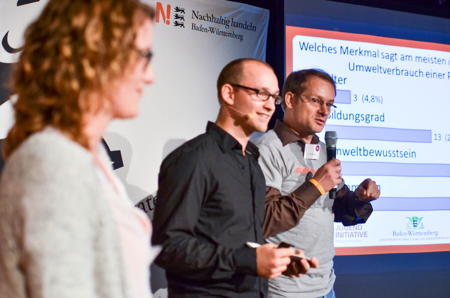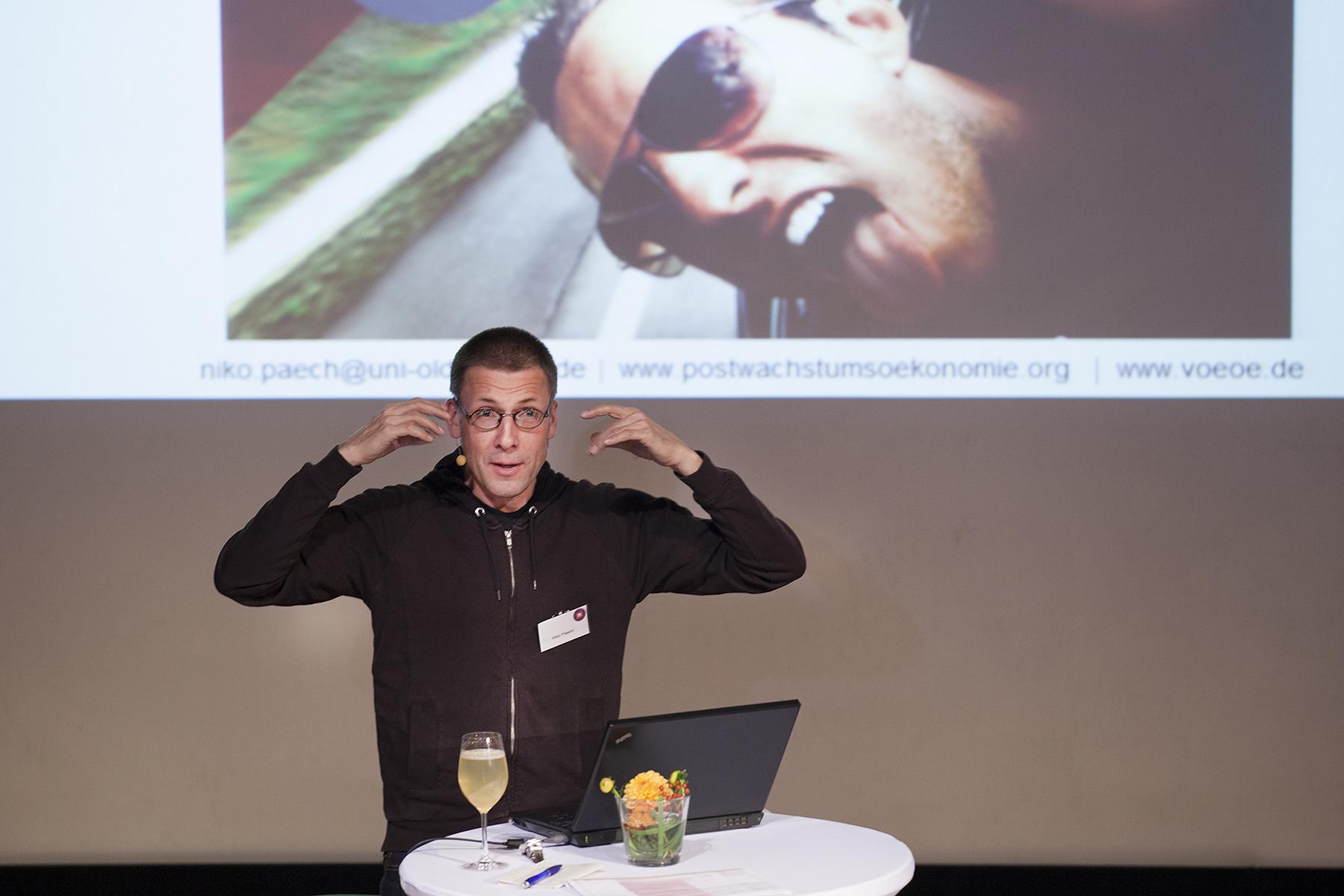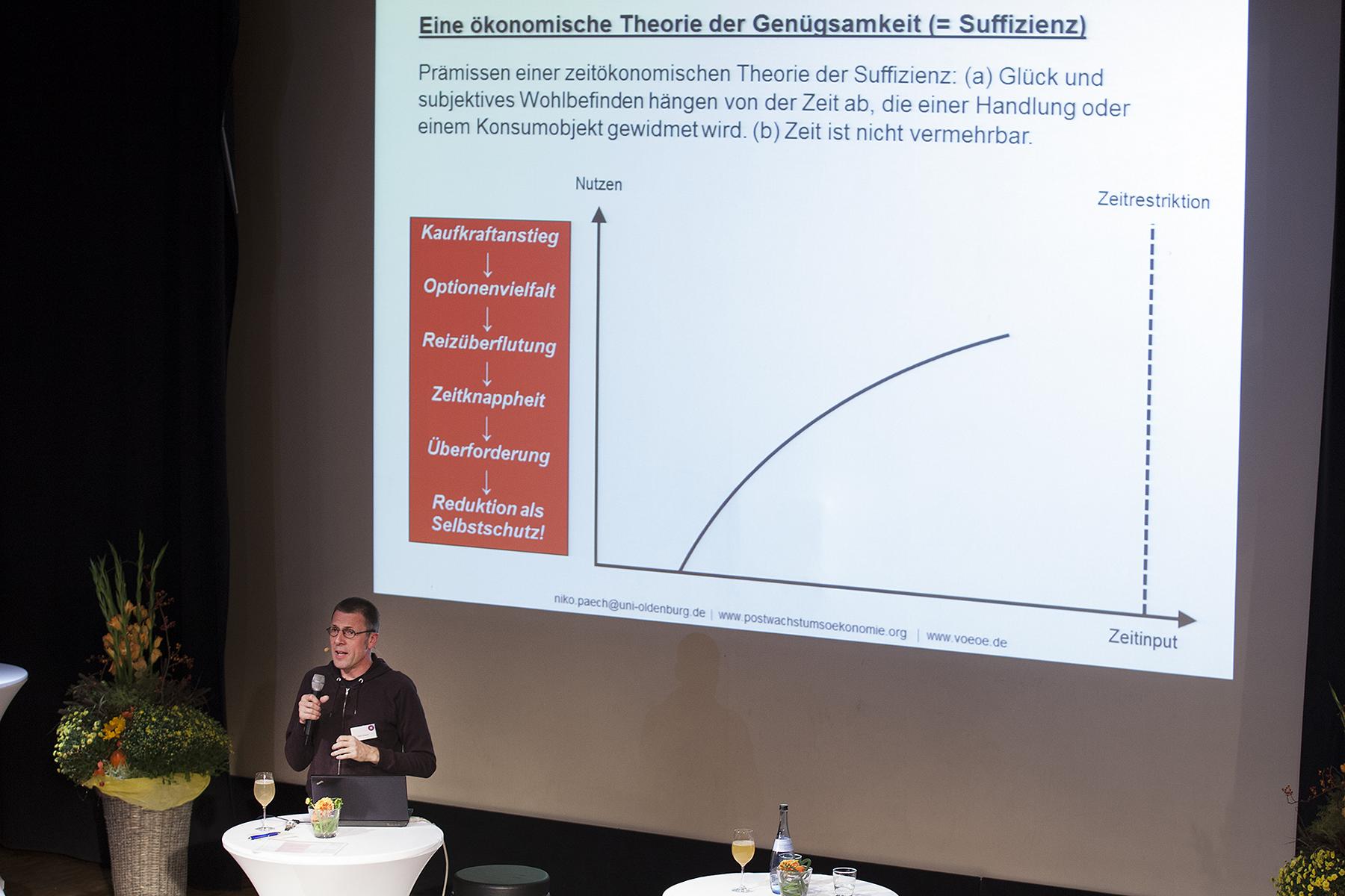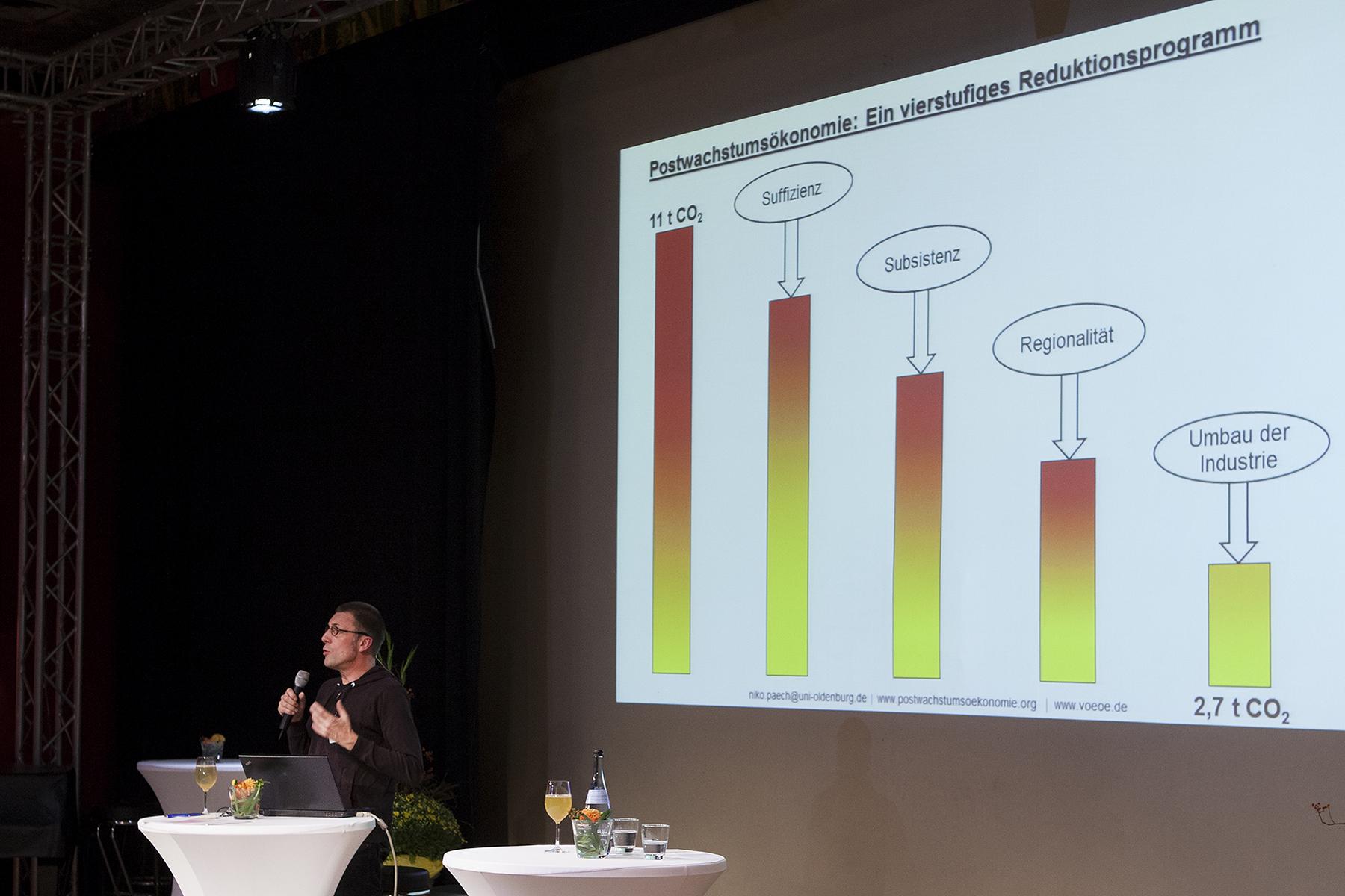 Bei der Abendveranstaltung hörten die KongressteilnehmerInnen und andere BürgerInnen erst den Wissenschaftler Prof. Dr. Niko Paech und seinen Vortrag zur Postwachstumsökonomie. Anschließend wurden die tagsüber erarbeiteten Workshop-Ergebnisse vorgestellt und gemeinsam mit dem Minister für Umwelt, Klima und Energiewirtschaft Franz Untersteller diskutiert.