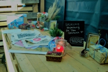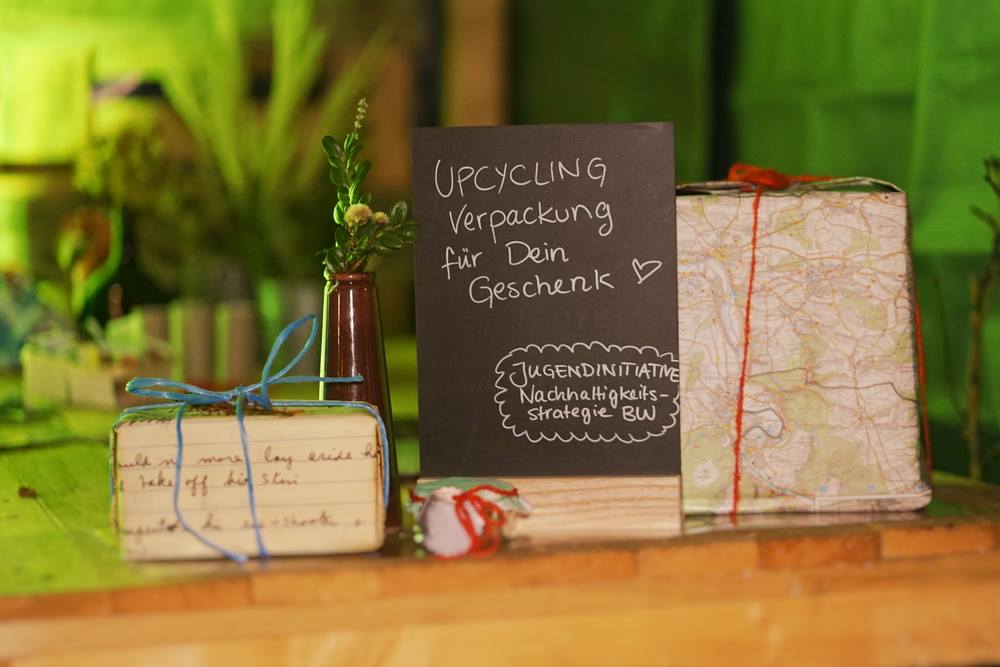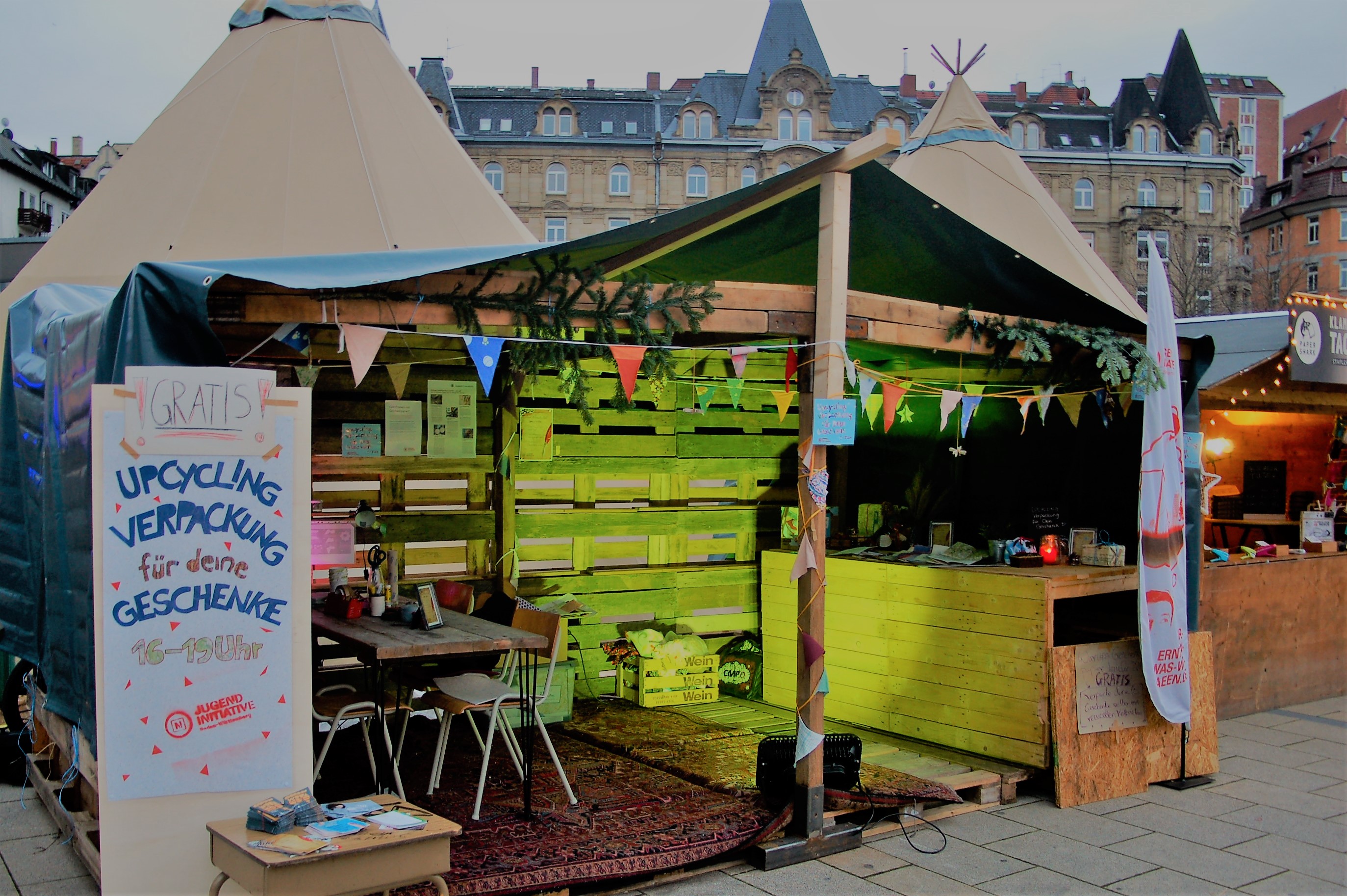 Vom 1. – 9.Dezember konnten alle Besucher*innen täglich von 16 – 19 Uhr die auf dem Wouahou erstandenen oder auch von zuhause mitgebrachten Weihnachtsgeschenke an unserem Stand verpacken. Dafür hatten wir zuvor fleißig Upcycling-Verpackungsmaterialien wie Kalenderblätter, veraltete Straßenkarten (z.B. vom ADFC Stuttgart), Schraubgläser, Naturmaterialien und Stoffreste gesammelt. Die Macher der TÜTLE statteten uns – rundum nachhaltig - mit Klebestreifen auf Naturkautschuk- und Kartoffelstärkebasis aus.
